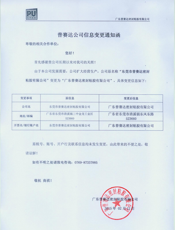 由于本公司發(fā)展需要,公司擴(kuò)大經(jīng)營(yíng)生產(chǎn),公司原名稱“東莞市普賽達(dá)密封粘膠有限公司”變更為“廣東普賽達(dá)密封粘膠有限公司”,具體變更信息如下: