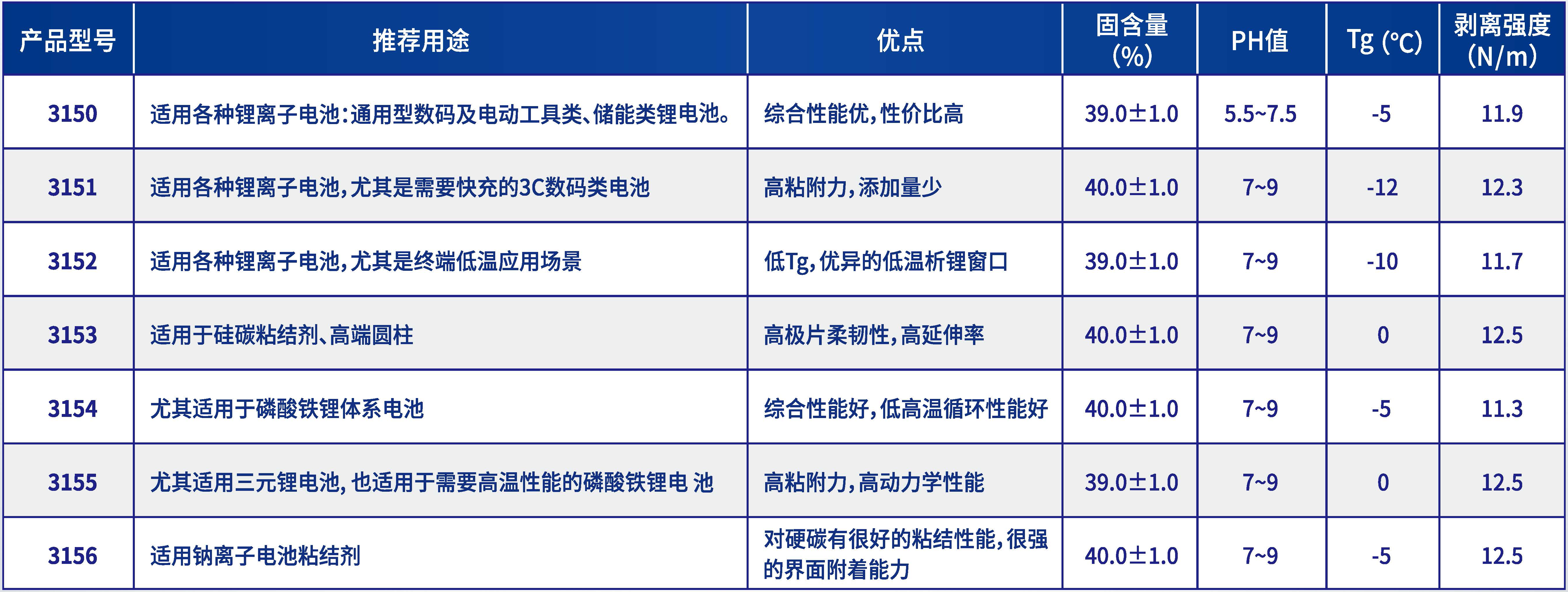 3150、3151、3152、3153、3154、3155、3156為第三代負極粘結(jié)劑,是以苯乙烯、類丁二烯、丙烯酸及丙烯酸酯為主要單體進行共聚,為乳液聚合水性乳液。