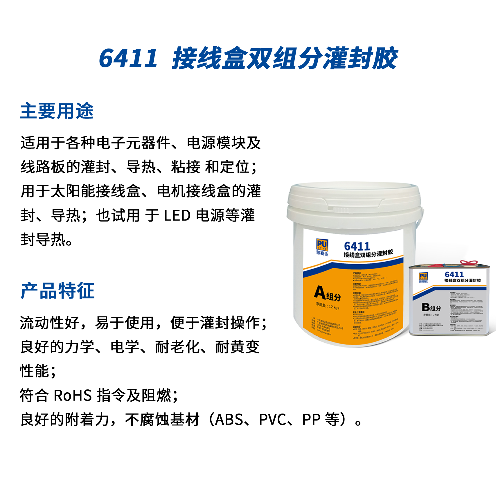 適用于各種電子元器件、電源模塊及線路板的灌封、導(dǎo)熱、粘接 和定位;用于太陽能接線盒、電機接線盒的灌封、導(dǎo)熱;也試用 于 LED 電源等灌封導(dǎo)熱。