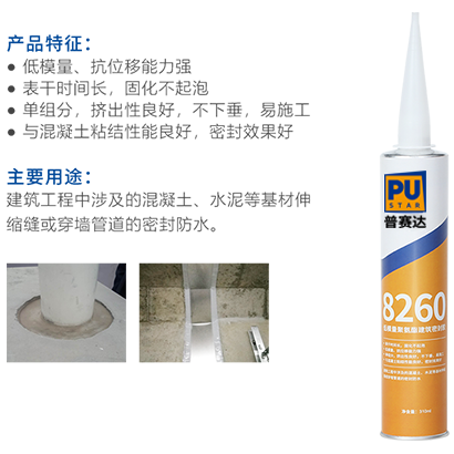 力鍵8260是單組分室溫濕氣固化聚氨酯密封膠,具有良好的密封性能和柔韌性能,對被粘基材無腐蝕,無污染,耐刺穿,易修補(bǔ),與水泥、石材等多種基材粘接性好。