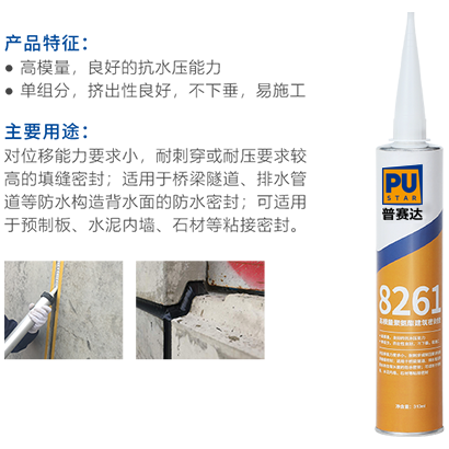 對位移能力要求小,耐刺穿或耐壓要求較高的填縫密封;適用于橋梁隧道、排水管道等防水構(gòu)造背水面的防水密封;可適用于預(yù)制板、水泥內(nèi)墻、石材等粘接密封。