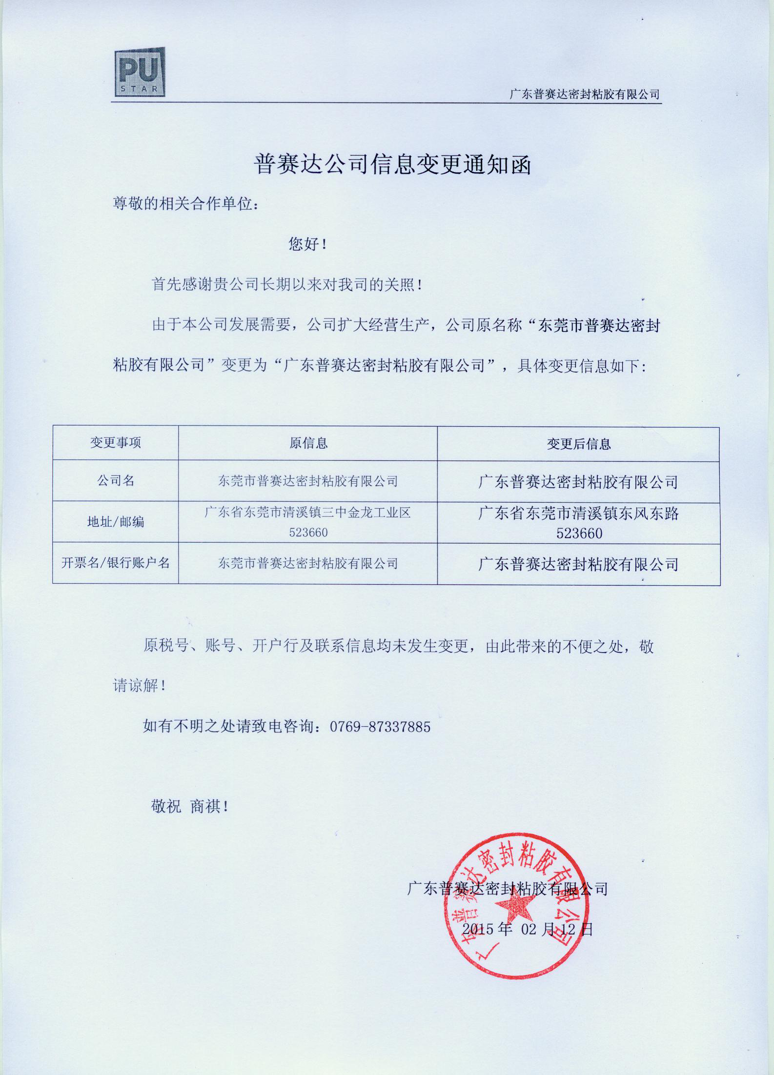 由于本公司發(fā)展需要,公司擴(kuò)大經(jīng)營(yíng)生產(chǎn),公司原名稱“東莞市普賽達(dá)密封粘膠有限公司”變更為“廣東普賽達(dá)密封粘膠有限公司”,具體變更信息如下: