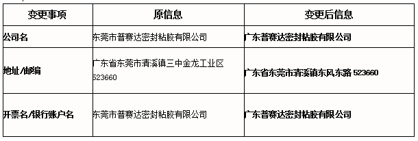 由于本公司發(fā)展需要,公司擴(kuò)大經(jīng)營(yíng)生產(chǎn),公司原名稱“東莞市普賽達(dá)密封粘膠有限公司”變更為“廣東普賽達(dá)密封粘膠有限公司”,具體變更信息如下: