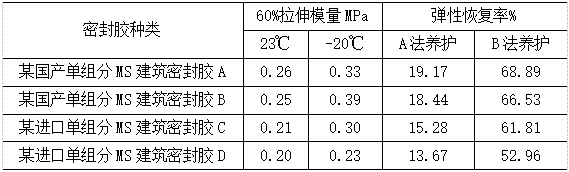 單組分MS建筑密封膠的基礎(chǔ)聚合物反應(yīng)活性相對較低,徹底反應(yīng)完全所需時間相對較長,如果標(biāo)準(zhǔn)給定的養(yǎng)護(hù)時間不夠,基團(tuán)反應(yīng)不徹底,密封膠內(nèi)部交聯(lián)程度不夠,彈性恢復(fù)率表現(xiàn)較低。采用JC/T 881-2001[7]對比4款國內(nèi)外MS建筑密封膠彈性回復(fù)率測試結(jié)果可知,按照A法養(yǎng)護(hù),測試結(jié)果(見表3)不符合標(biāo)準(zhǔn)要求,采用GB/T 22083-2008[8]對單組分MS建筑密封膠進(jìn)行分級,最高只能符合該標(biāo)準(zhǔn)中的12.5 P類型產(chǎn)品要求,結(jié)果為塑性材料,而實際的MS建筑密封膠為彈性密封膠,明顯欠妥;如果按照B法養(yǎng)護(hù),彈性恢復(fù)率可達(dá)到60%以上,符合GB/T 22083-2008標(biāo)準(zhǔn)中的20LM類型產(chǎn)品要求,測試結(jié)果為彈性材料。綜上所述,由于現(xiàn)今沒有專門針對MS建筑密封膠應(yīng)用的標(biāo)準(zhǔn),套用按應(yīng)用領(lǐng)域或分級界定的標(biāo)準(zhǔn)明顯欠妥,使得單組分MS建筑密封膠在建筑市場領(lǐng)域,尤其是PC外墻密封領(lǐng)域推廣異常困難。